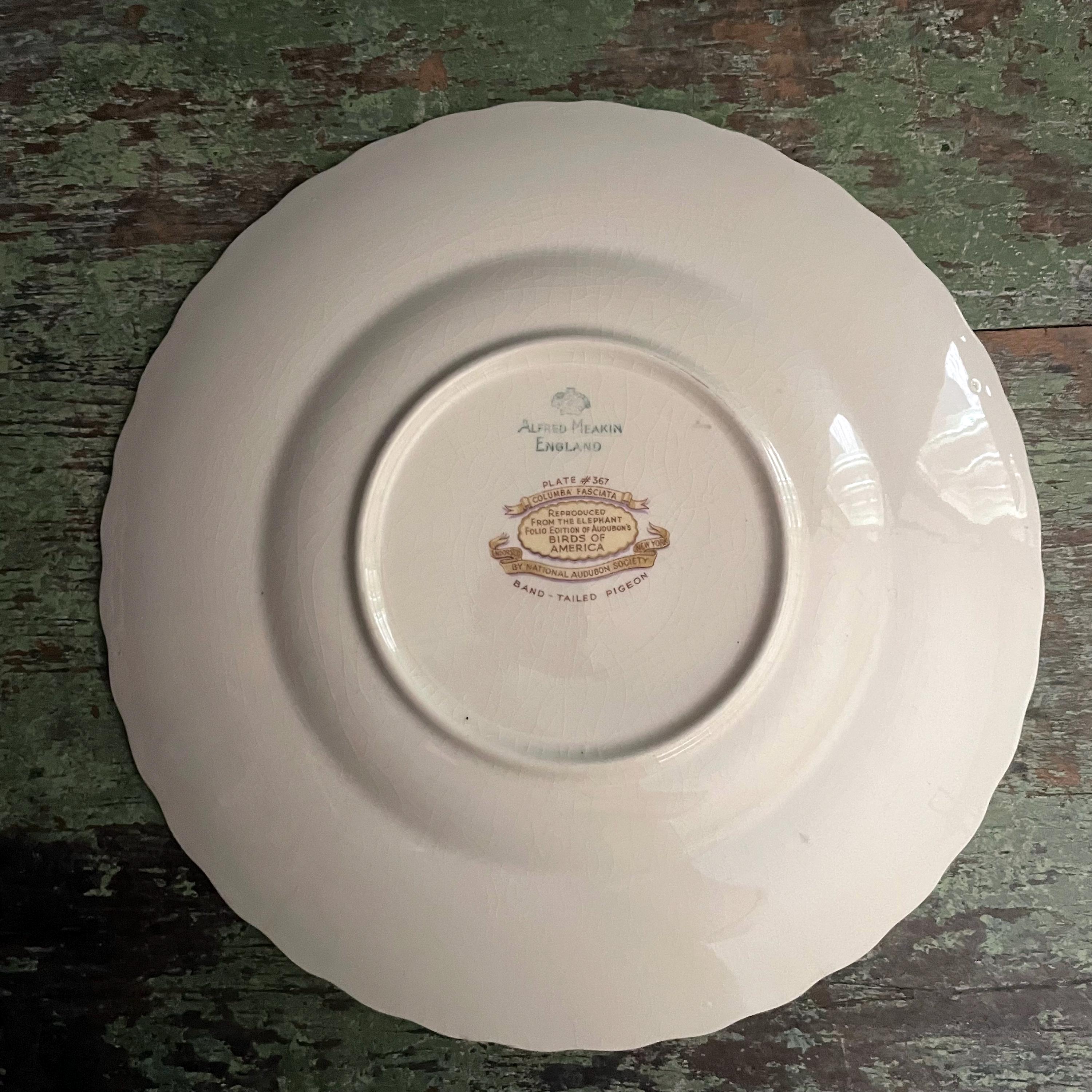Vintage Pigeon dish by Alfred Meakin. From the Birds of America dinnerware circa 1940s, each plate has a National Audubon Society image transfer. This is from plate #367 and is the "Band-Tailed Pigeon" featured in a central motif with an embossed off white rim. Each dinner plate measures 10 7/8". There are two available, sold separately and in varying condition. Please see pull down menu and condition description below.
