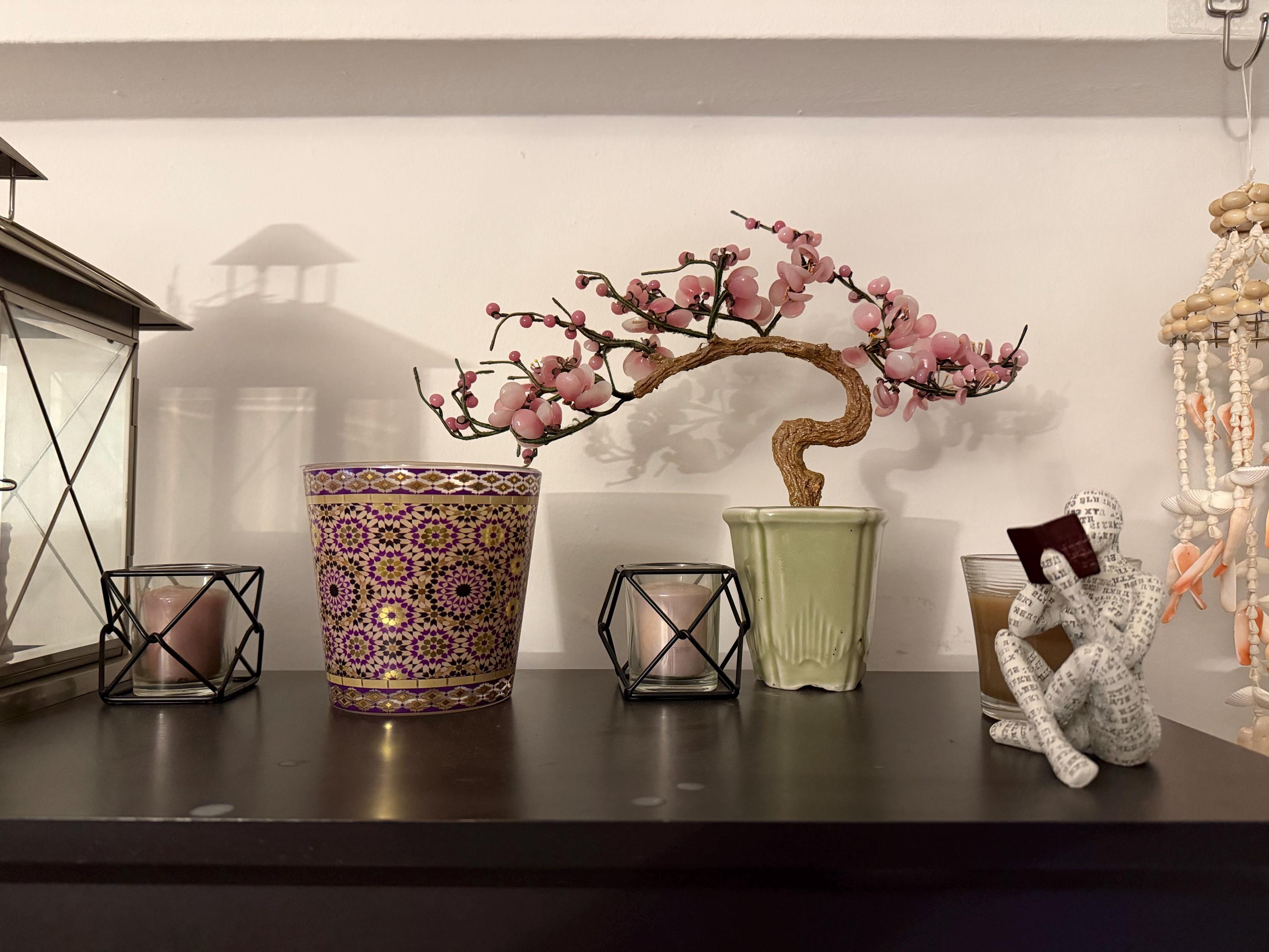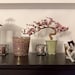 A vintage bonsai tree, flowering with glass petals. A cherry blossom with pink blooms, this handcrafted flower arrangement has a Japanese influence and sprouts from a celadon green, ceramic pot.